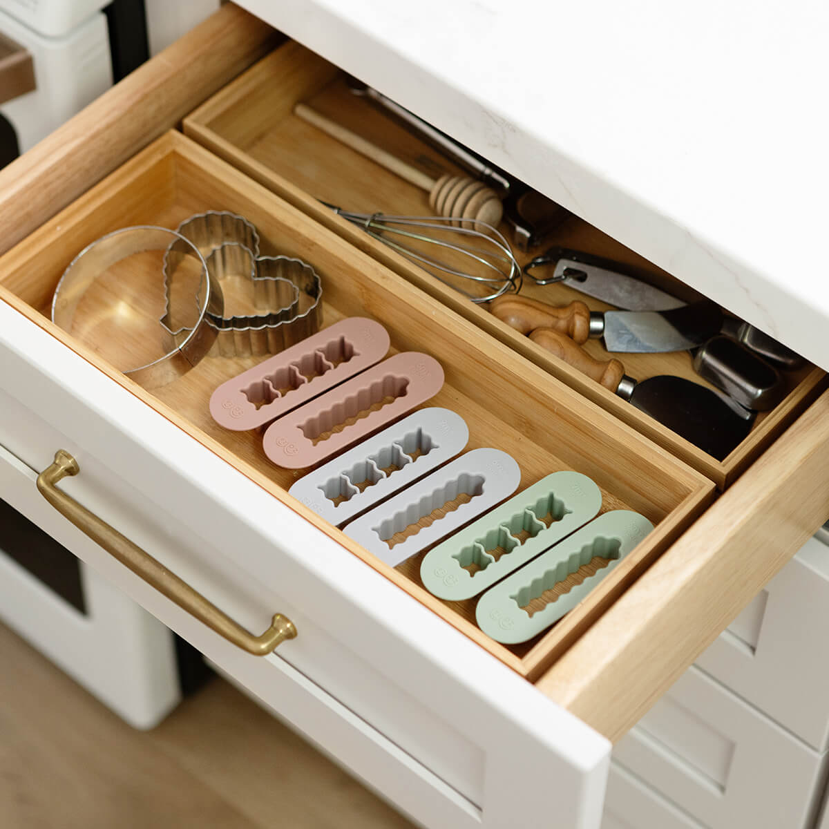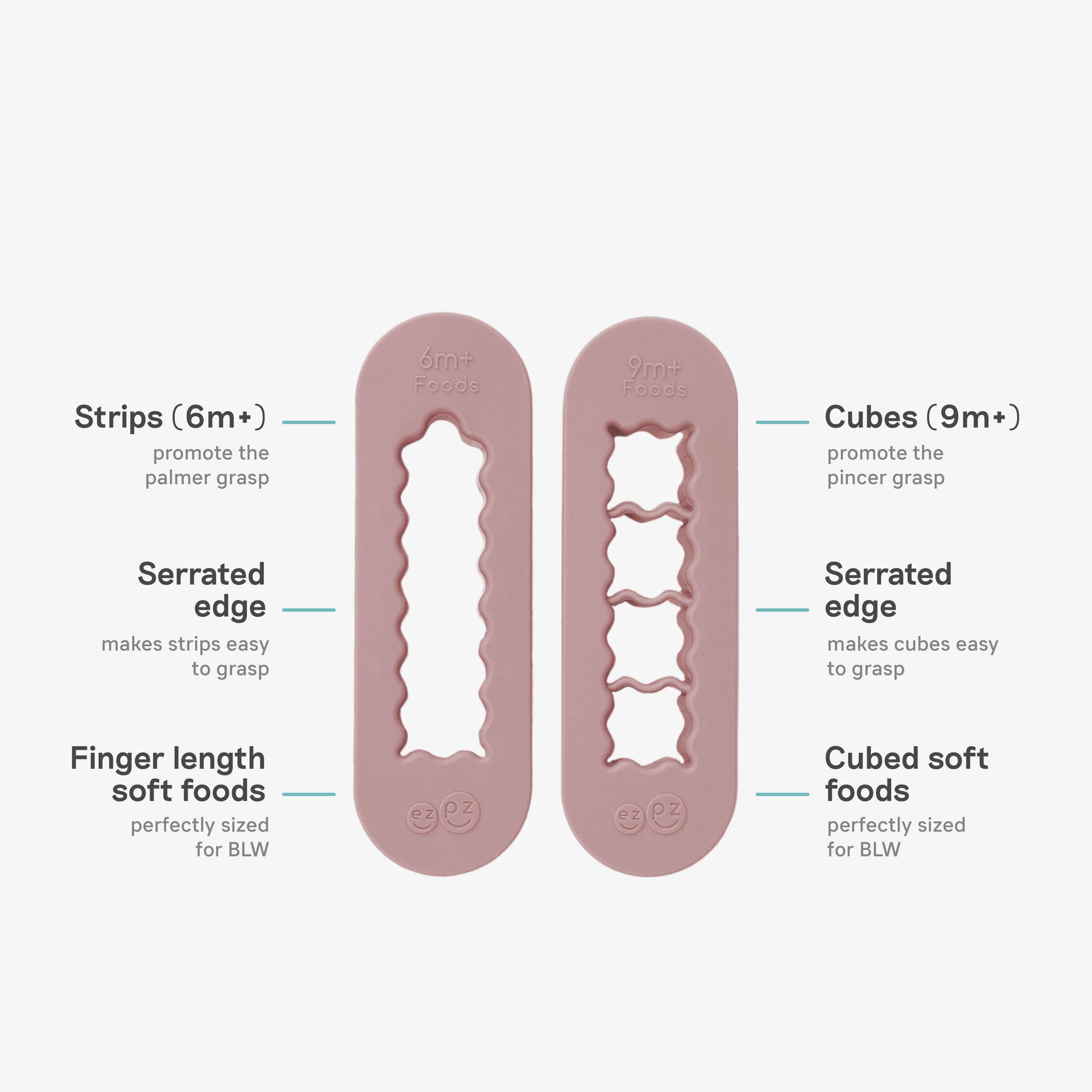 The ezpz food cutters make baby-led weaning food prep ezpz! Start with the food cutter for food strips (6m+) to promote the palmar grasp. At 9m+ layer in the cubed food cutter to promote the pincer grasp.