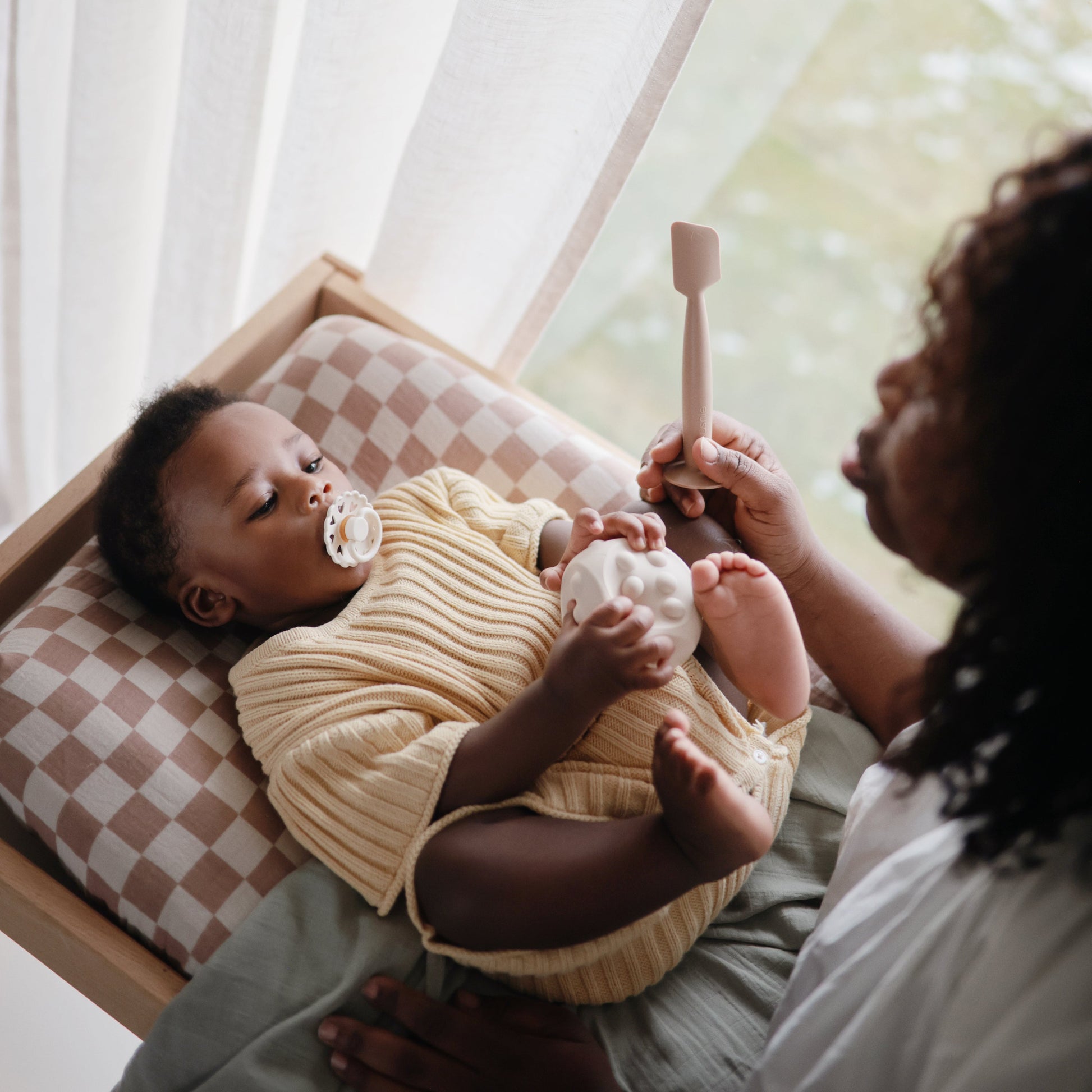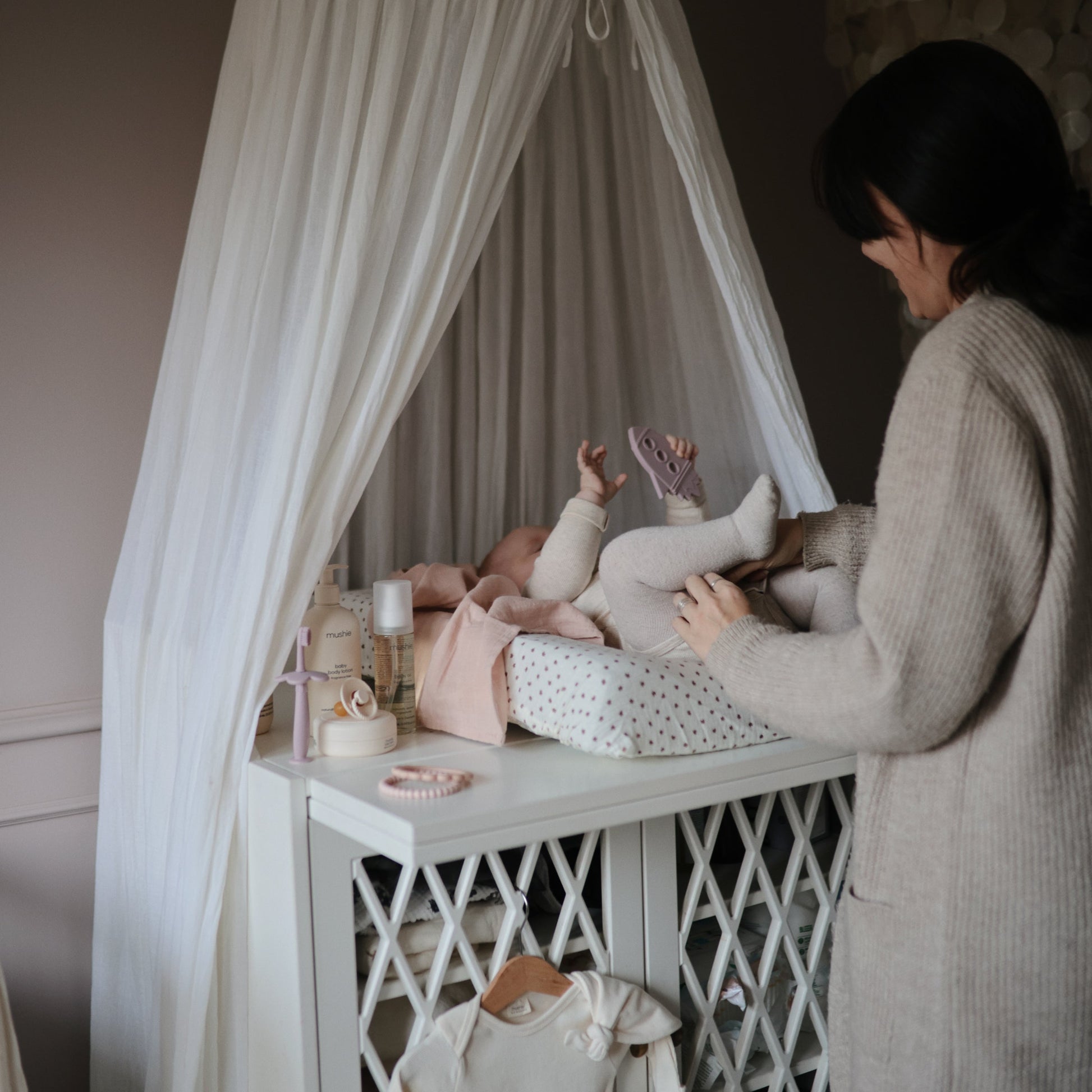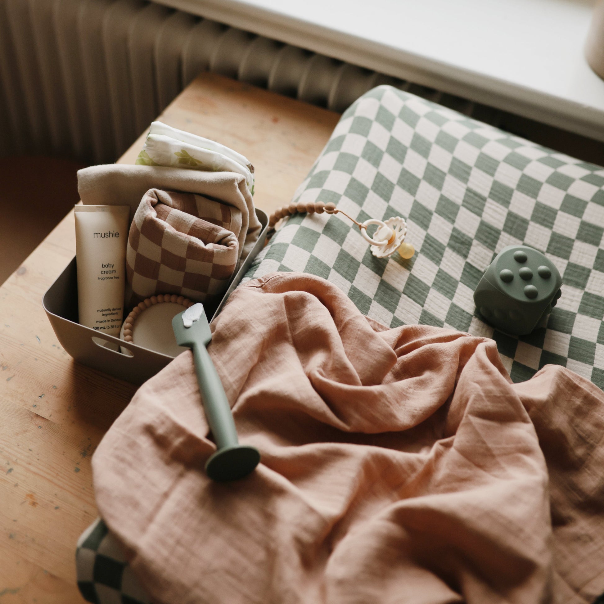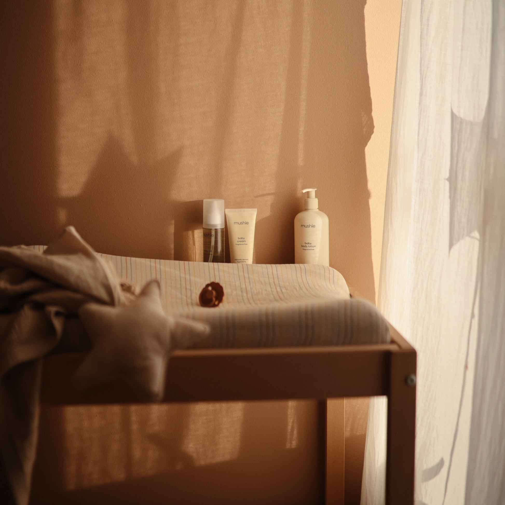 Made from 100% cotton, Mushie's cozy, extra-soft muslin changing pad cover is pre-washed for softness against baby's delicate skin. Muslin stays breathable while keeping your baby warm and cuddly.