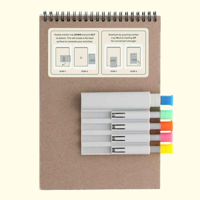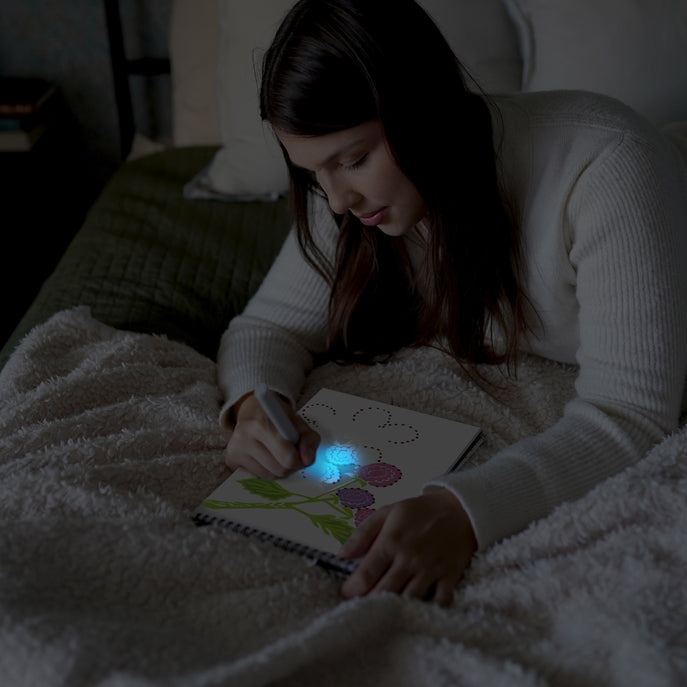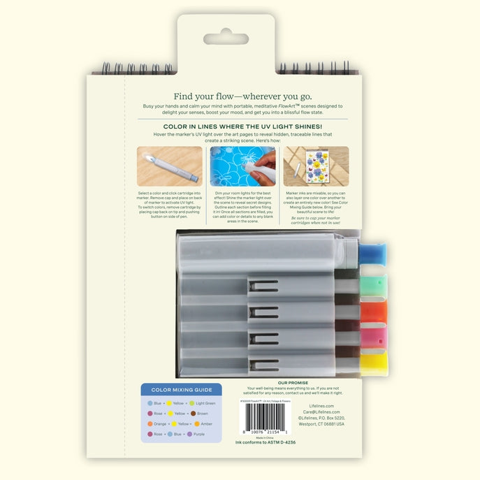 UV Art includes 20 meditative scenes and an innovative illuminating marker with 5 interchangeable colors, all in a detachable storage tray. Hover the marker's UV light over the page to reveal hidden, traceable scenes. Experience full immersion into this mesmerizing activity, as the illumination brings captivating detail to life, drops you into your flow, and results in a striking scene. Compact and portable, this pad is perfect for calming your mind on-the-go, unwinding before bed, or taking a work or study break to de-stress.
