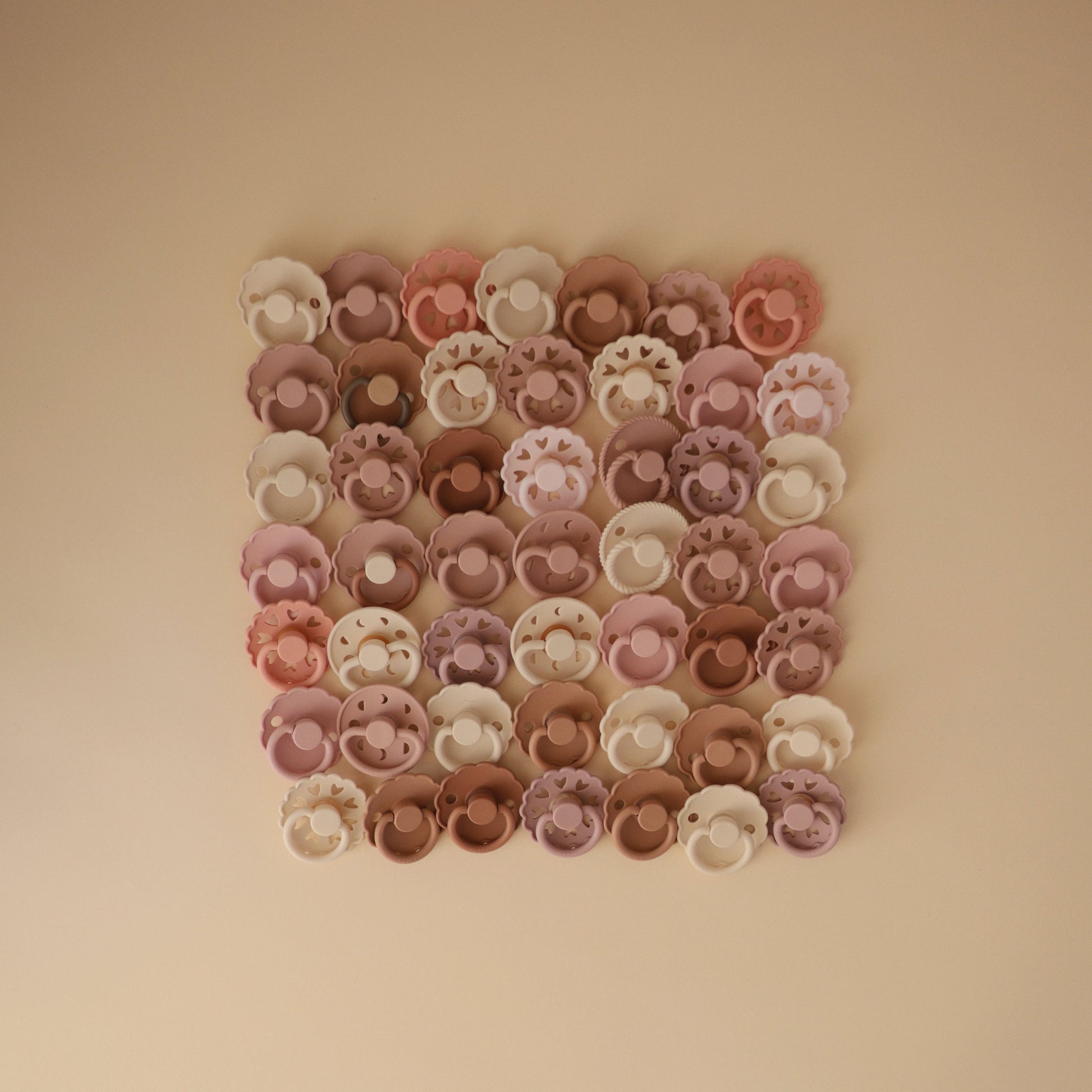 The FRIGG Fairytale rubber pacifiers are thoughtfully designed for your baby's comfort with natural latex and soothing properties. Each pacifier color draws inspiration from a timeless story by Danish author Hans Christian Andersen. The outward curve keeps the pacifier off delicate skin while features like air holes and a security handle ensure your baby's safety. Within the pacifier shield, air holes reveal eight little hearts that recreate Andersen's carved artwork motif and symbolize the universal language of love.