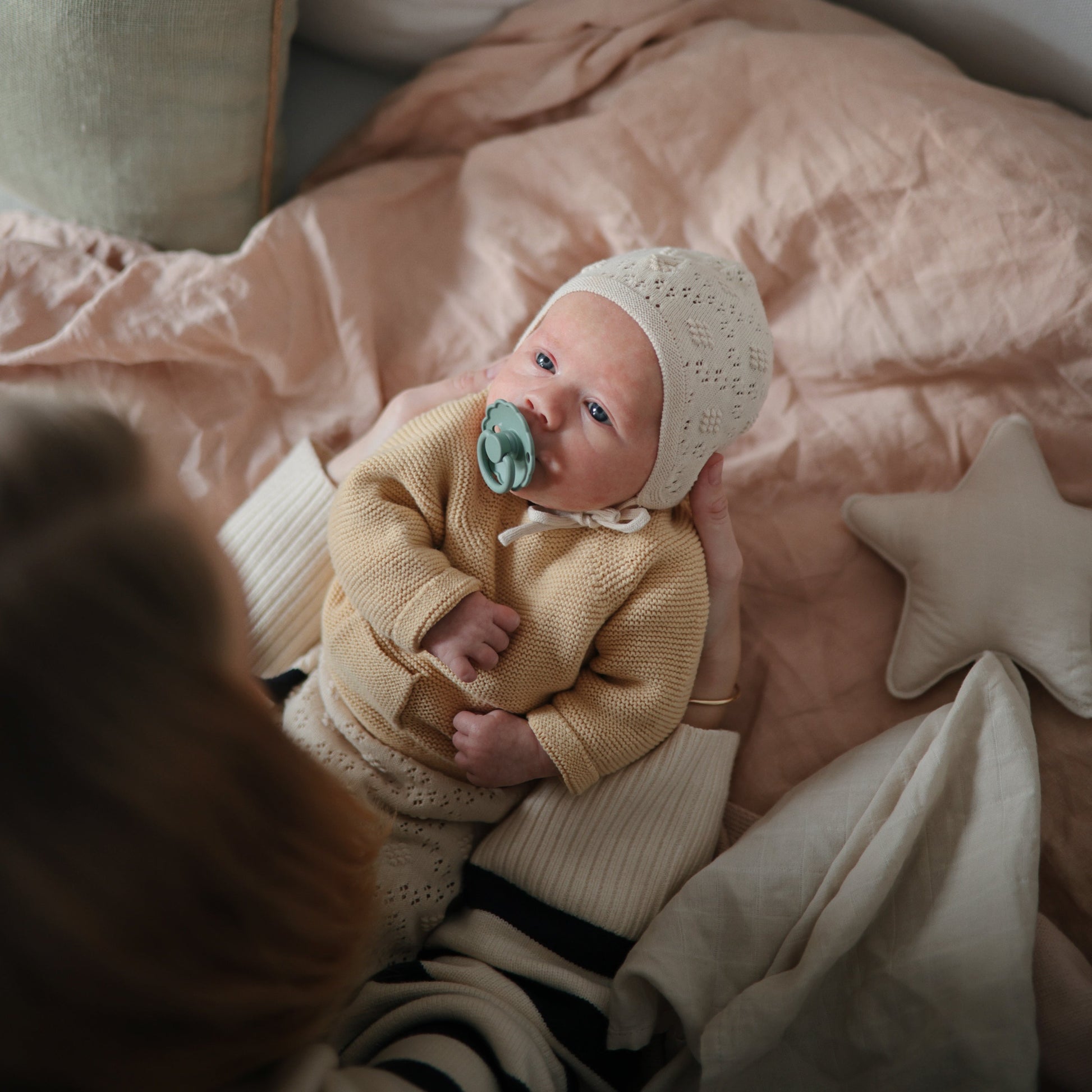The FRIGG line of daisy silicone pacifiers with improved SilkySoft™ nipple and an innovative Click-lock System has been thoughtfully designed for your baby's comfort. The outward curve keeps the pacifier off their delicate skin, while features like air holes and a security handle ensure your baby stays safe. Available in a range of soft colors, FRIGG pacifiers make a beautiful addition to your collection of baby essentials.