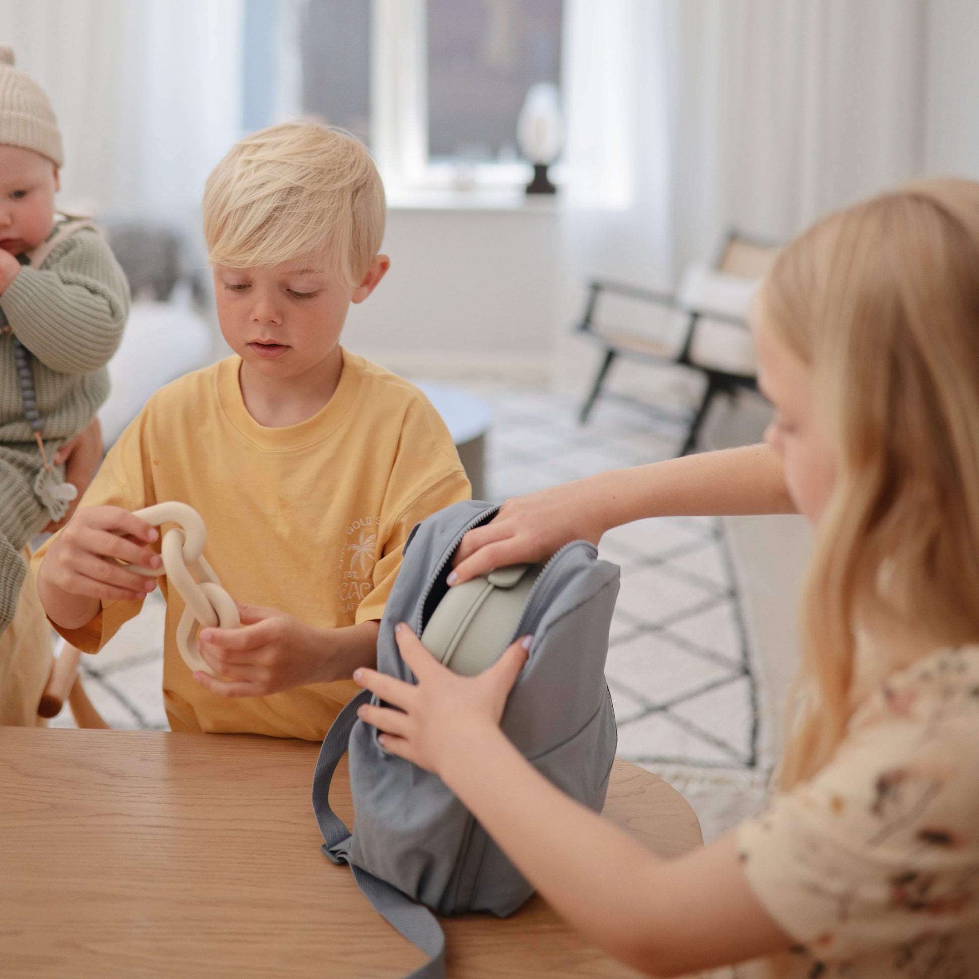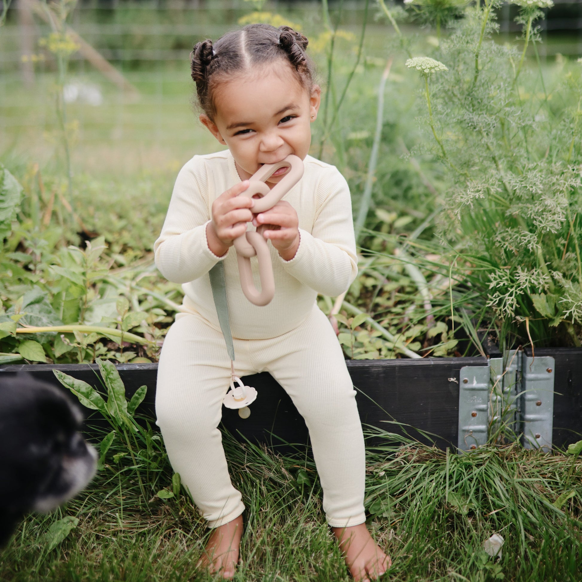 Offer comfort and relief with a teether designed to soothe sore gums throughout the entire teething journey. Made from 100% food-grade silicone, Mushie's teether is easily held by tiny hands. With three connecting links that mirror modern design aesthetics, parents can maintain their personal style while littles enjoy a practical and playful toy.