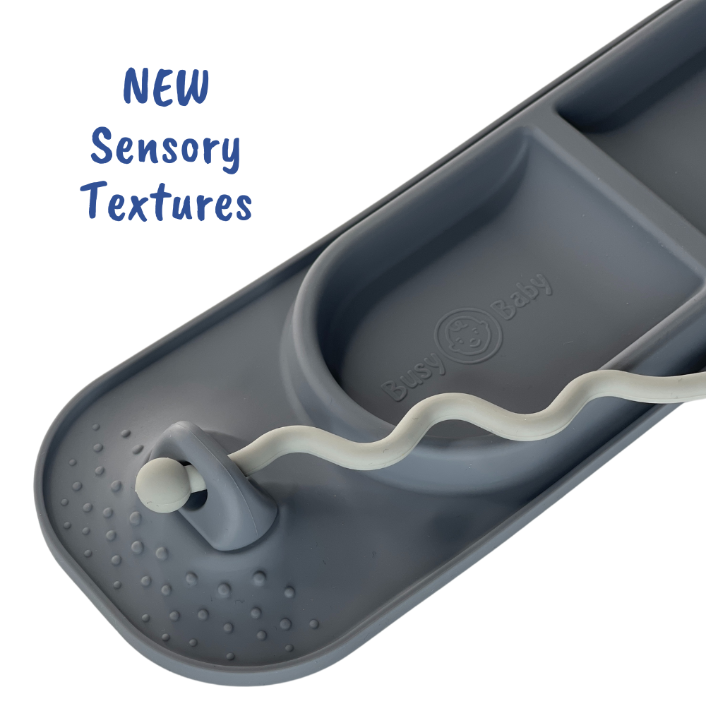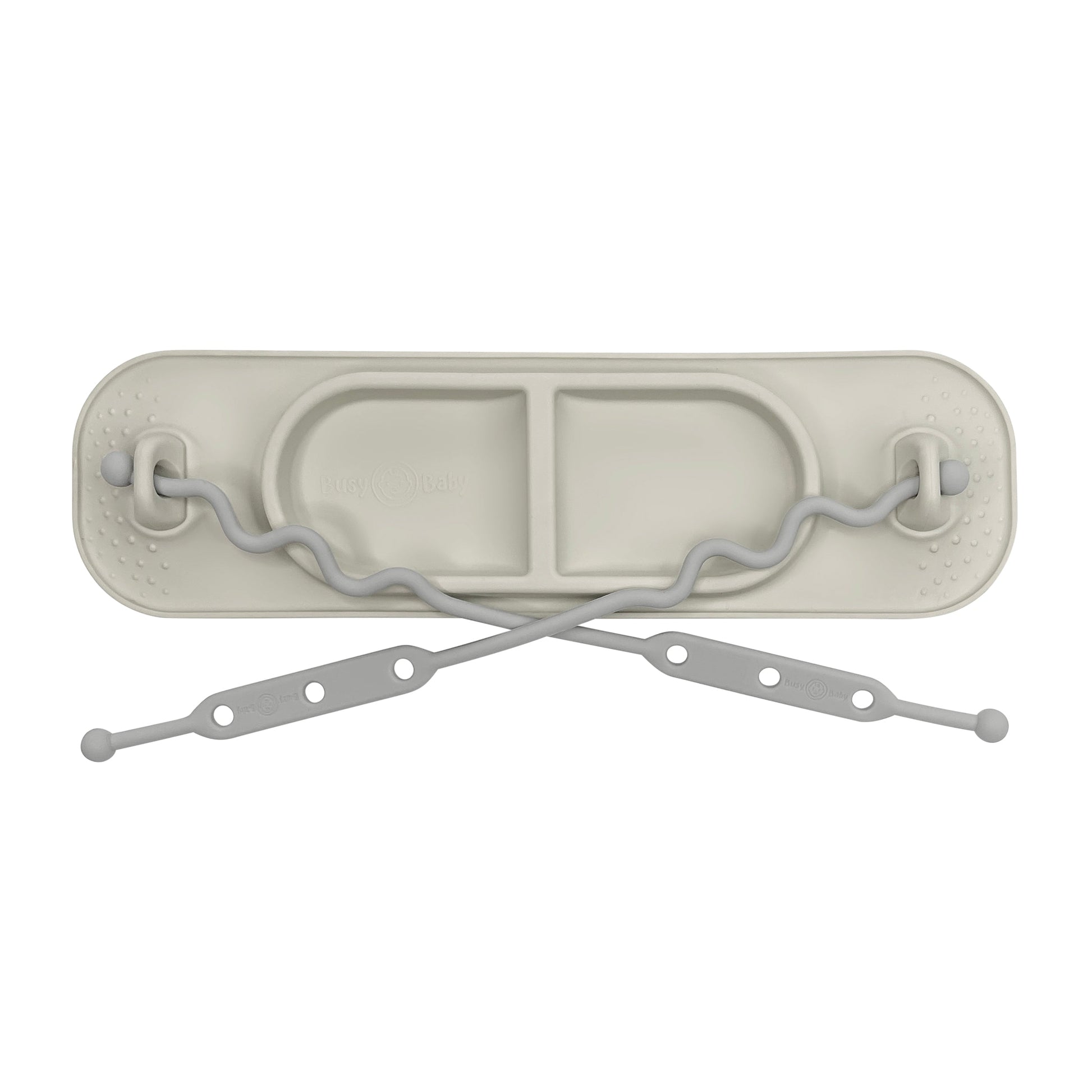 The Mini version of Busy Baby's award-winning Silicone Placemat makes it perfect for smaller trays or travel. NEW AND IMPROVED suction and sensory features. It includes three suction cups to keep the mat in place on smooth surfaces or to wrap around stroller handles, shopping carts and more. 2 tethers (toy straps) keep utensils, toys, and teethers within reach and off the floor! Use it at home or on-the-go with the convenient travel wet bag. *Will not work with Lalo or Stokke Tripp Trapp high chairs.