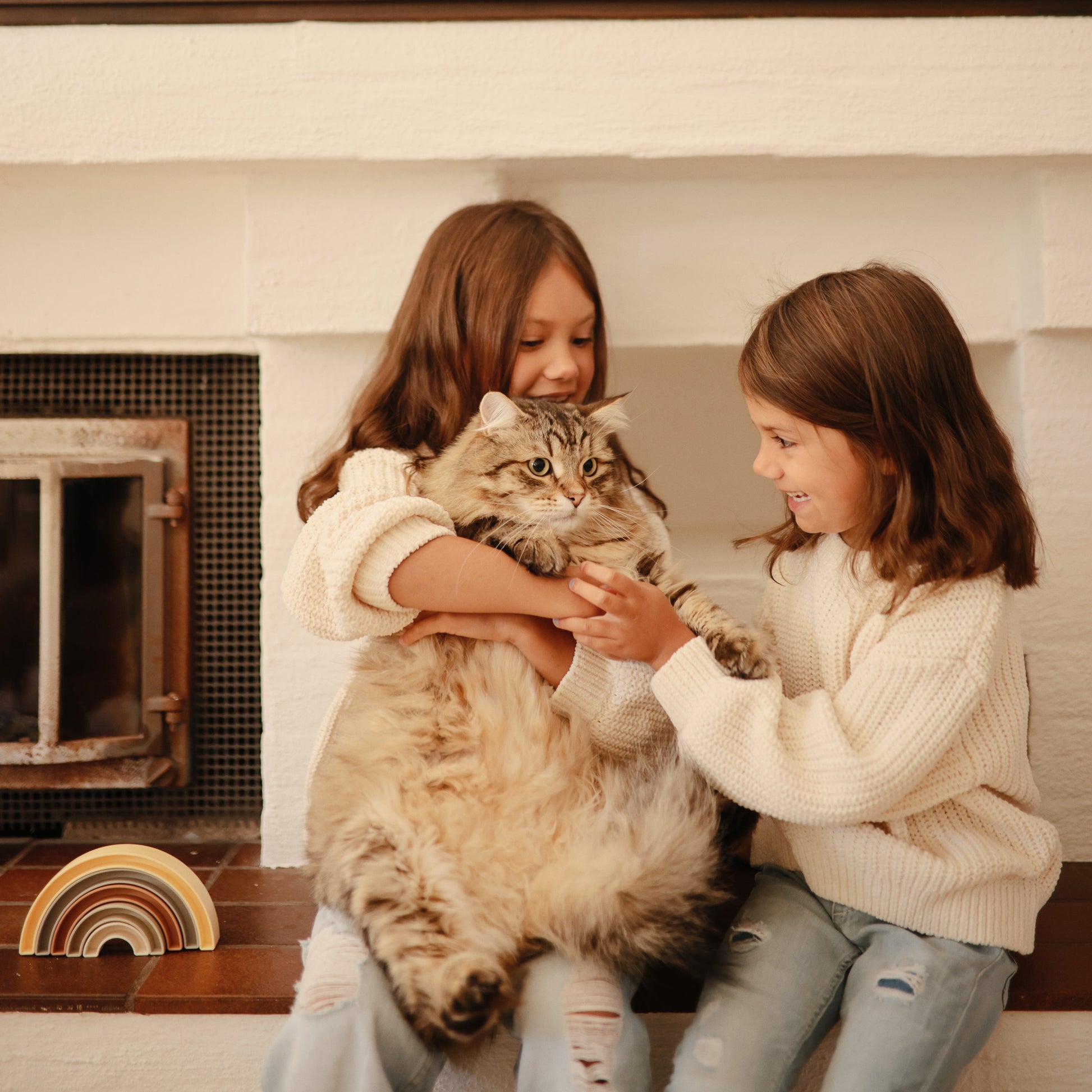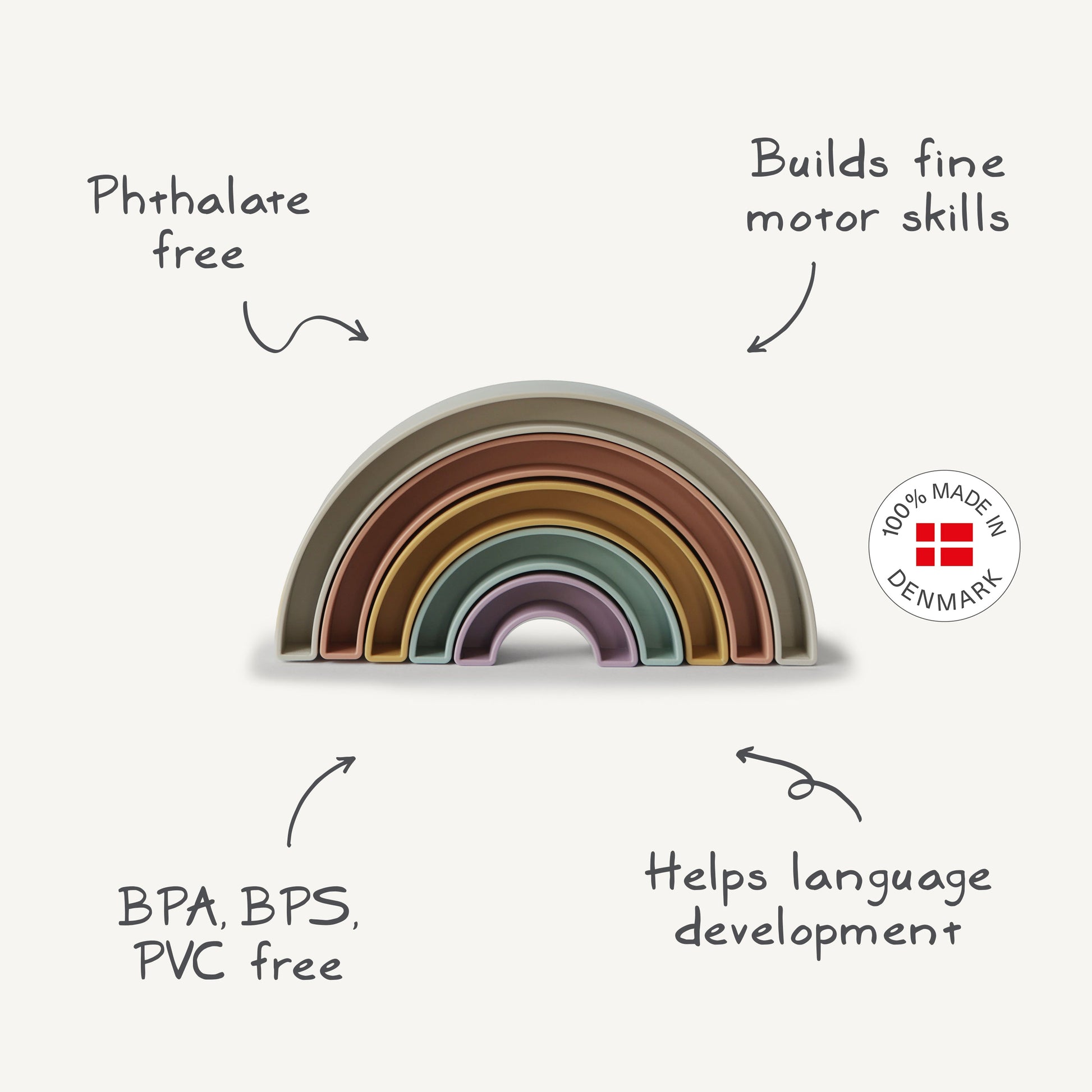 From the Danish hygge collection comes this playful rainbow stacker, inspired by the rainbow skywalk in Aarhus, Denmark. Little ones will sort, stack and play with this beautiful set, all while learning with soft colors and developing their fine motor skills.