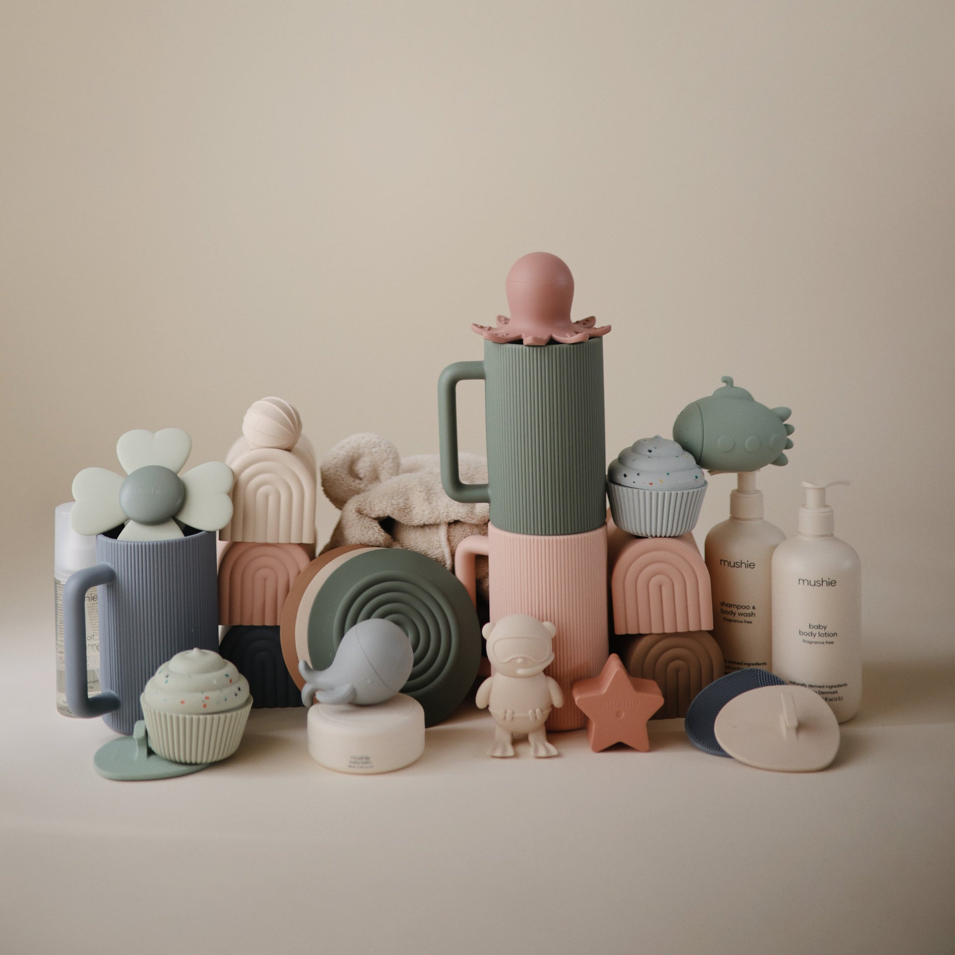 Make bathtime fun and hassle-free with Mushie's set of 2 silicone bathtub drain covers. These durable, flexible stoppers create a secure seal, ensuring water stays put for endless splash-filled fun. Easy to clean and simple to use, these soft silicone drain stoppers make bathtime an enjoyable and stress-free experience for both littles and parents. Pairs well with their bath rinse cup and spout cover for a calming and cohesive look.