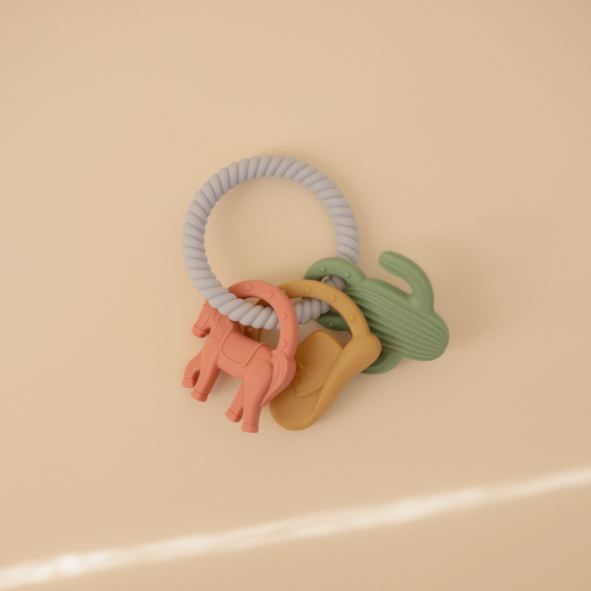 Help little ones explore sensory rich shapes and textures with the Mushie western theme teething ring. Made from 100% food grade silicone, teething babies will enjoy sinking their gums into the soft material that satisfies the natural urge to chew. Featuring stimulating colors and a rope texture around the ring, this toy inspires playful moments and creates opportunities for discovery.