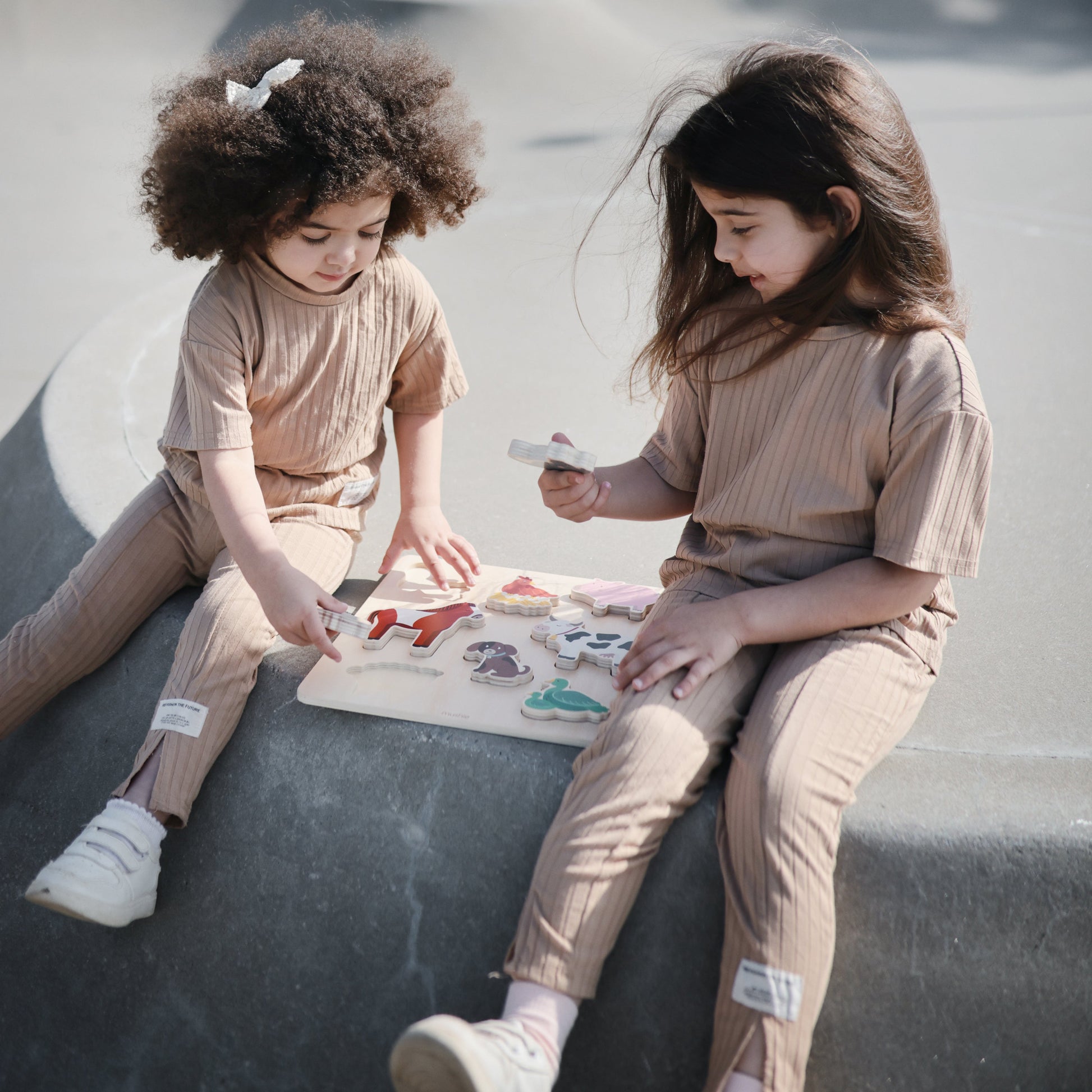 Introduce children to farm animals with Mushie's wooden farm puzzle. Crafted from FSC certified wood and non-toxic paint, this is a timeless toy designed to help teach little learners colors and spatial reasoning. The set includes eight barnyard animal themed pieces with smooth edges that are made for tiny hands. Littles will improve fine motor skills and hand-eye coordination as they grasp, manipulate and fit the pieces into their corresponding slots.